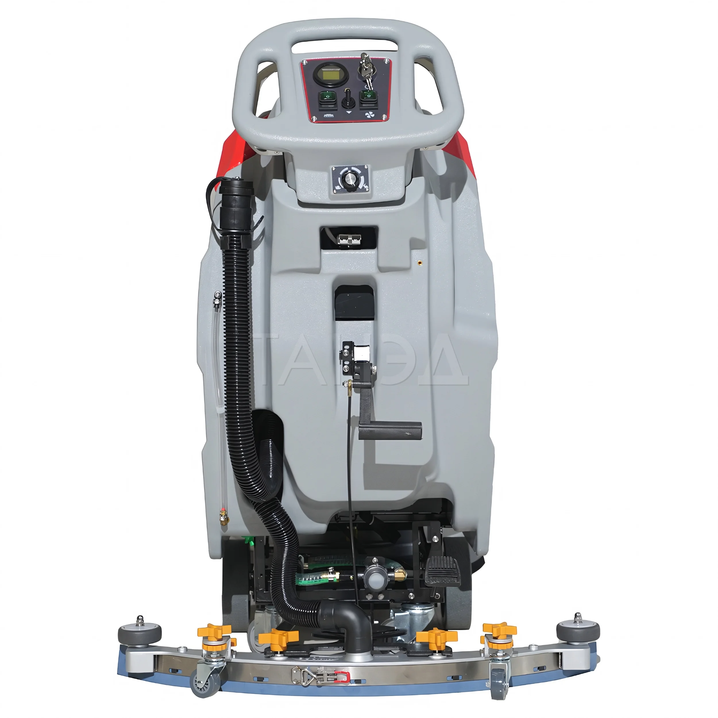 После обработки поверхности жидкость собирается всасывающей системой. Всасывающая балка расположена в задней части оборудования. Резиновые скребки собирают воду и направляют ее в систему всасывания. Жидкость поступает в бак для грязной воды. После заполнения бак очищается через сливной патрубок или шланг.