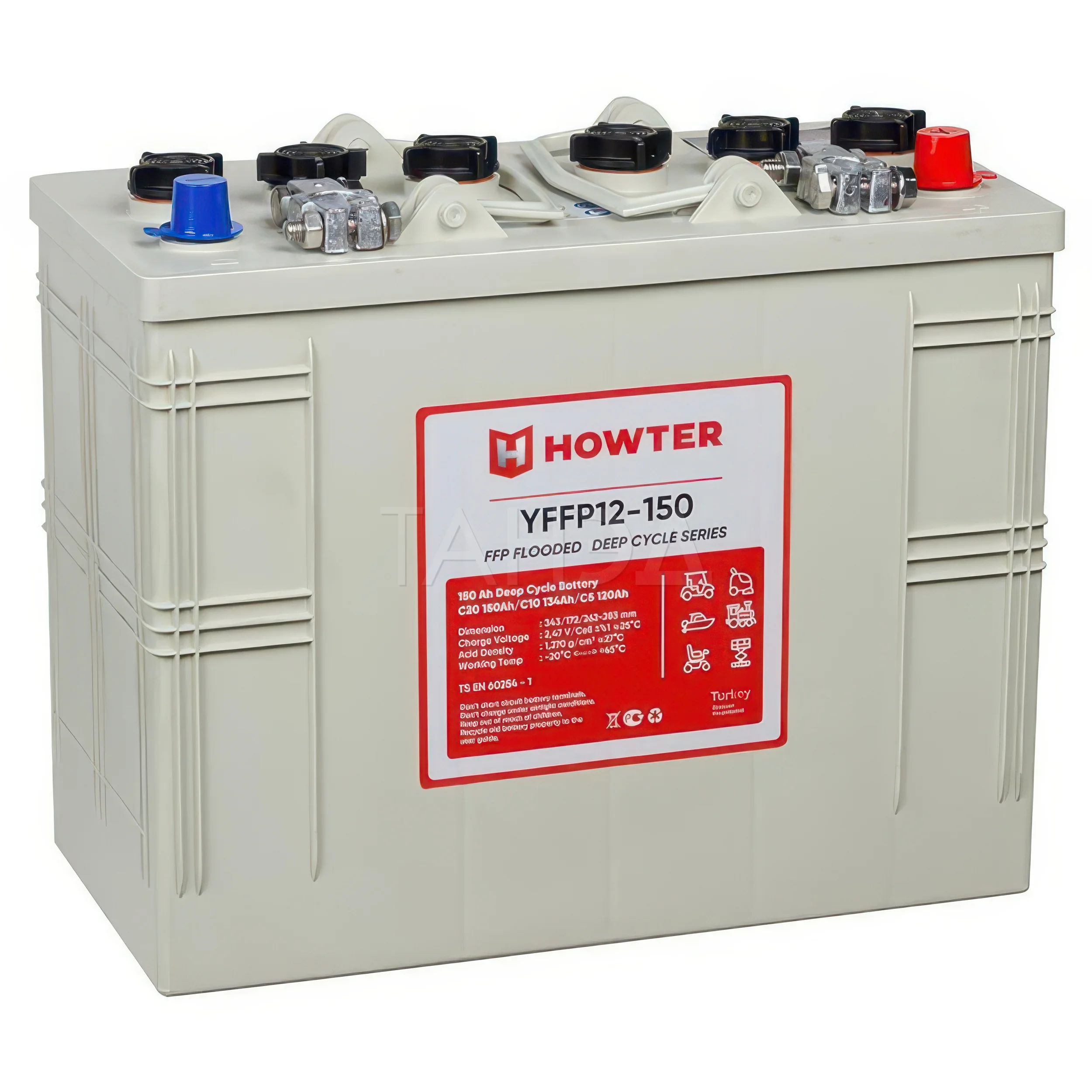 Тяговый аккумулятор HOWTER FFP 12 150 – это свинцово-кислотная батарея глубокого разряда. Показатель напряжения 12 В, емкость 150 Ач, вес АКБ 43,0 кг.