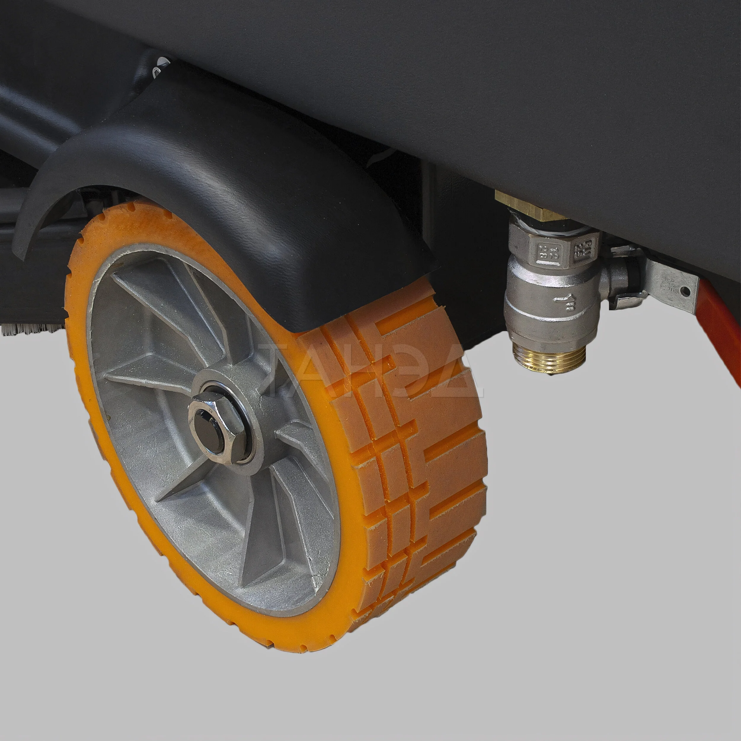Мощность вакуумного двигателя составляет 350 Вт, двигателя щеток — 550 Вт. Всасывающая балка шириной от 660 до 1000 мм собирает раствор без разводов, оставляя пол сухим.