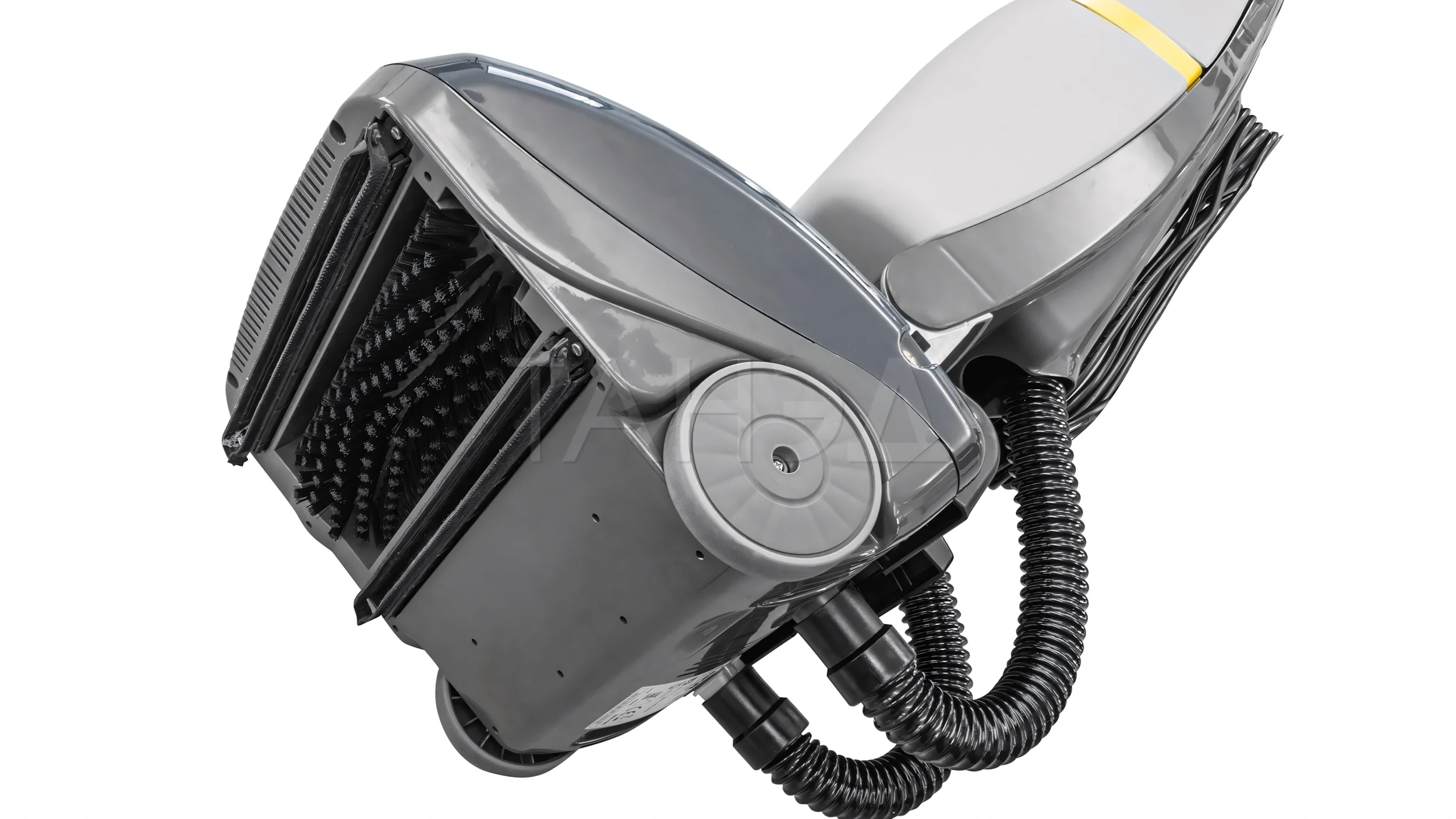 Панель управления расположена на рукоятке. Оператор управляет включением щетки, системой всасывания и подачей воды. Конструкция предусматривает простой доступ к бакам и рабочим узлам. Слив грязной воды выполняется после завершения работы.