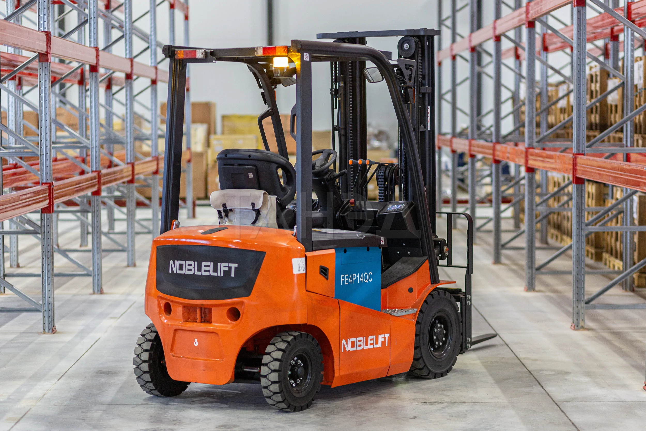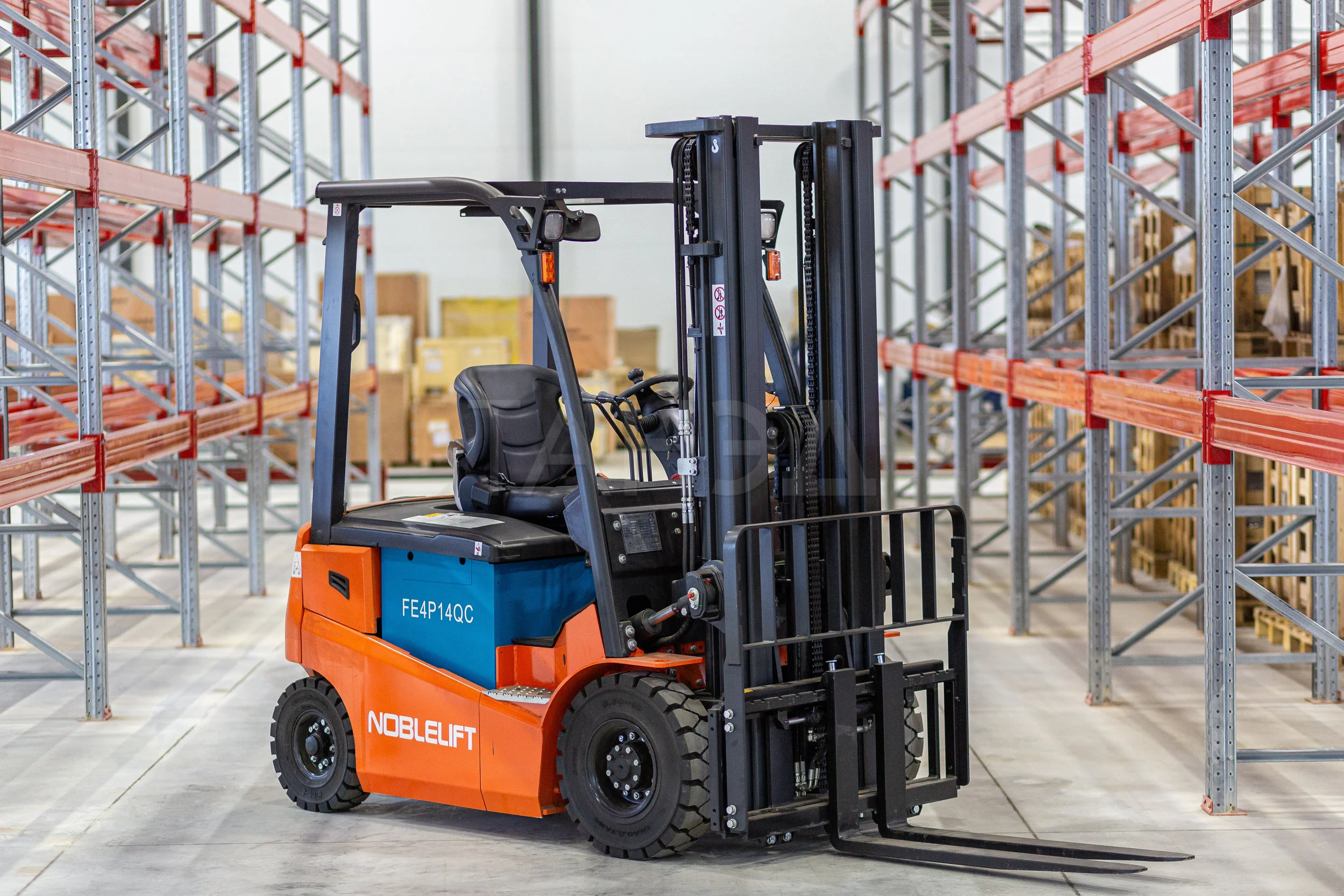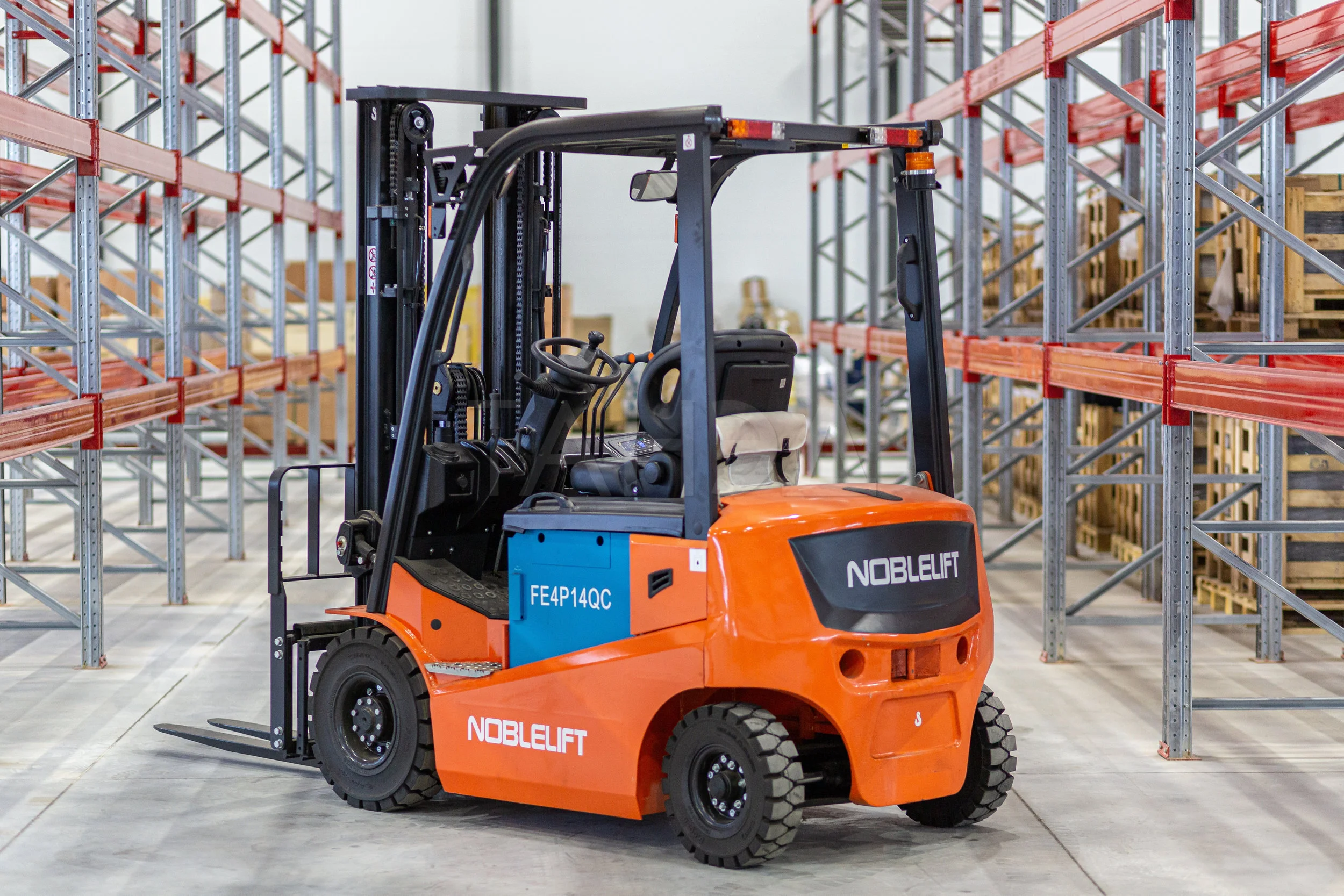 Noblelift FE4P14Q с грузоподъемностью 1400 кг и высотой подъема 5 м. Радиус разворота 1820 мм, батарея 48V/360Ah (WET). AC-двигатели, Curtis-контроллер и эргономичная кабина обеспечивают экономичность и комфорт для складов малой интенсивности.