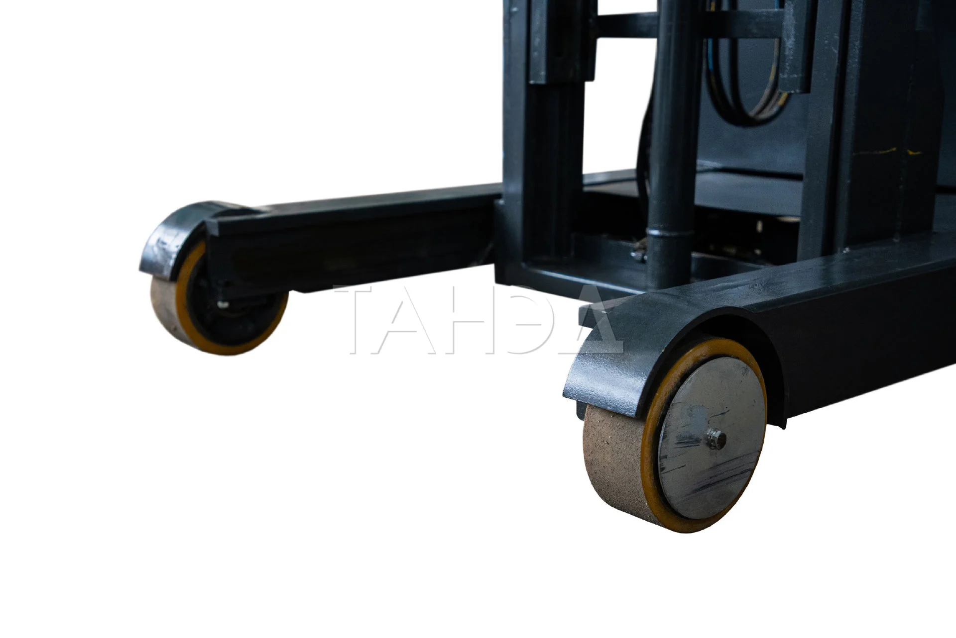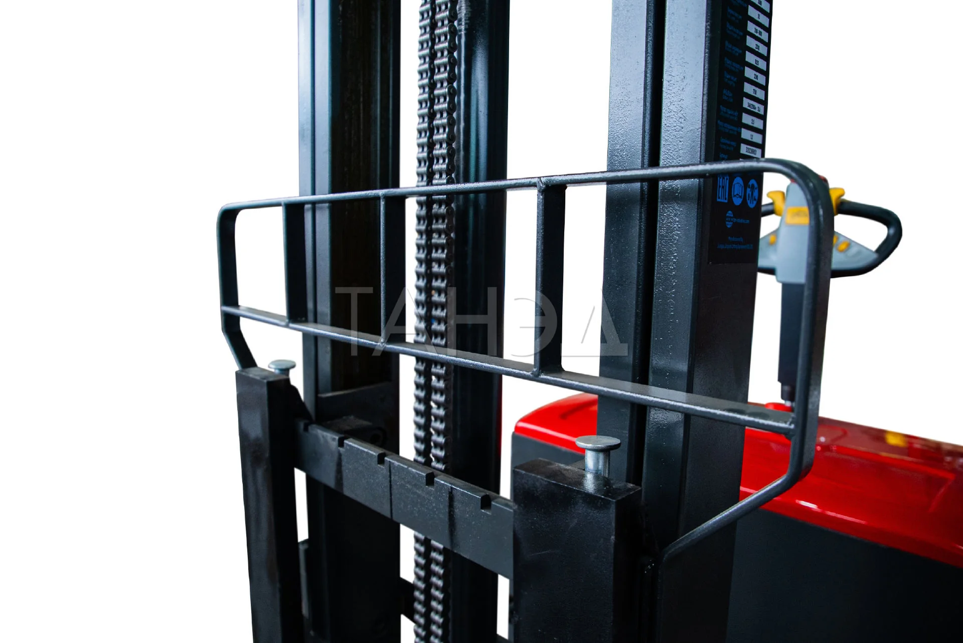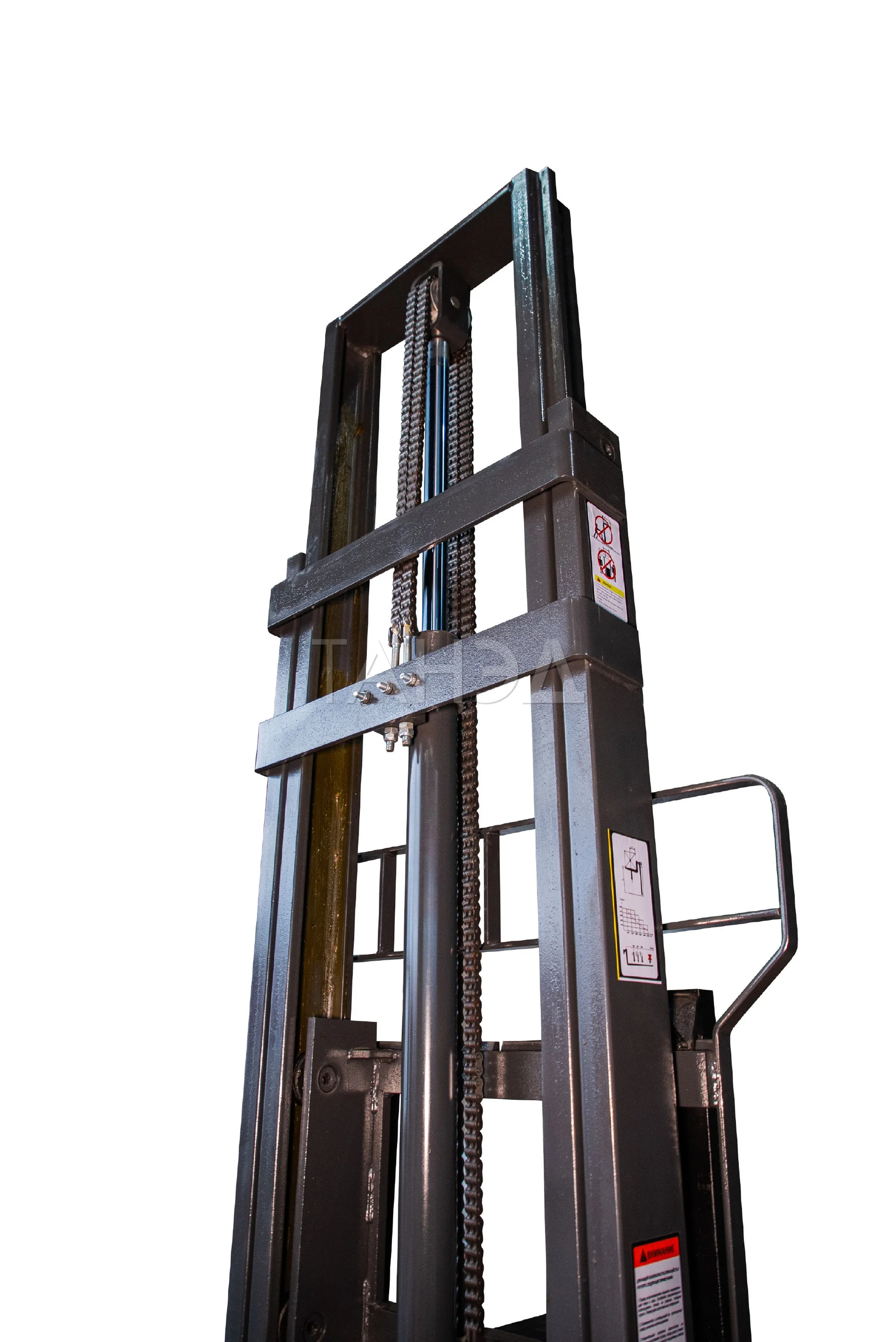 Конструкция включает усиленную стальную раму с массивным противовесом. Широко разнесенные направляющие и опорные ролики, а также низкий собственный центр массы – делают штабелер устойчивым в движении, исключает наклоны корпуса при подъеме грузов на максимальную высоту. Телескопическая мачта с двумя секциями без свободного хода. Питание – гелевый аккумулятор 12 вольт, 120 Ач.