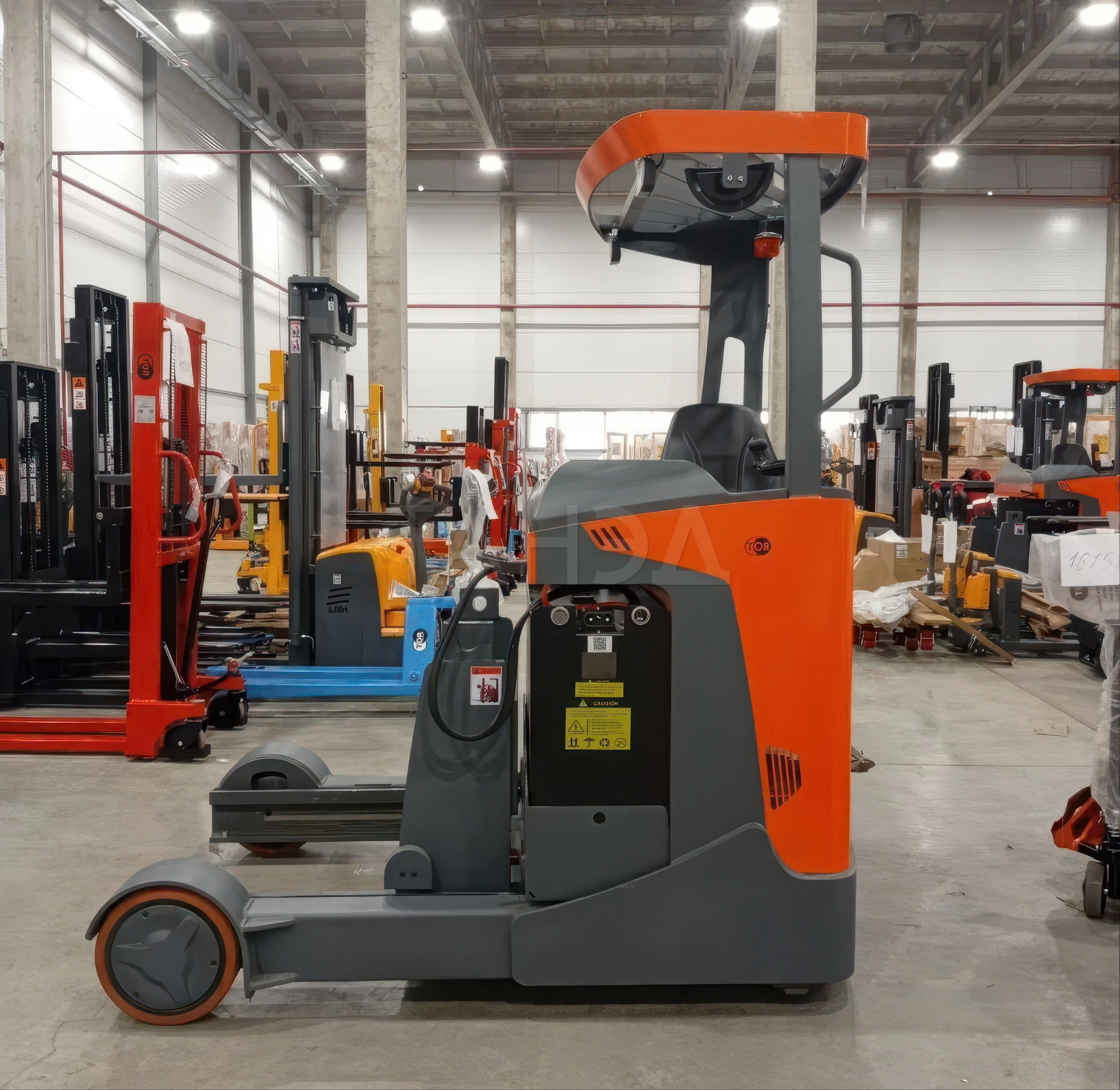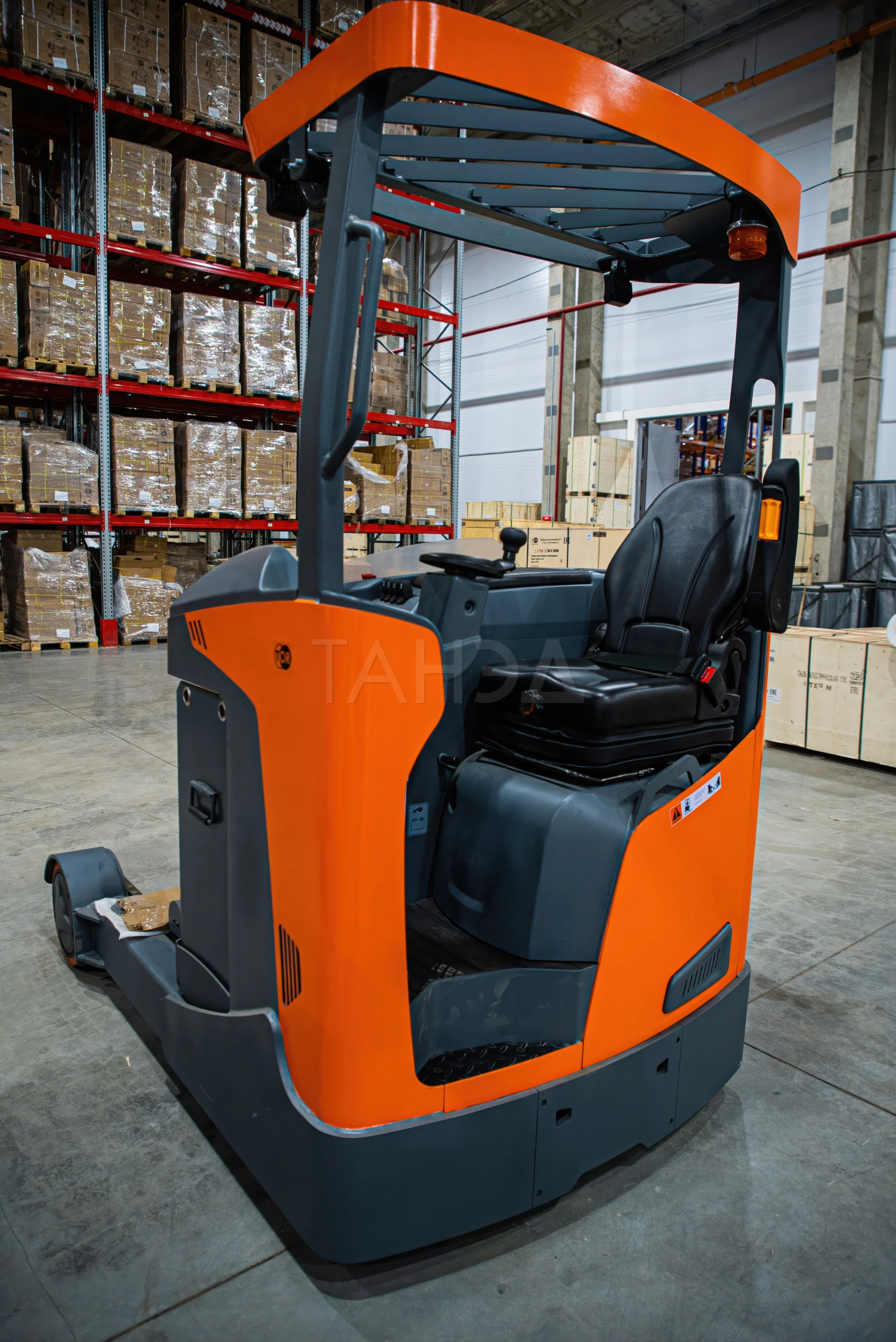 Ричтрак с кабиной TOR 2.0 т, 8.6 м CQD20-D способен поднимать грузы весом до 2 тонн на высоту до 8,6 метра. Работает от свинцово-кислотного аккумулятора, поставляется без АКБ. На вилах установлена камера.