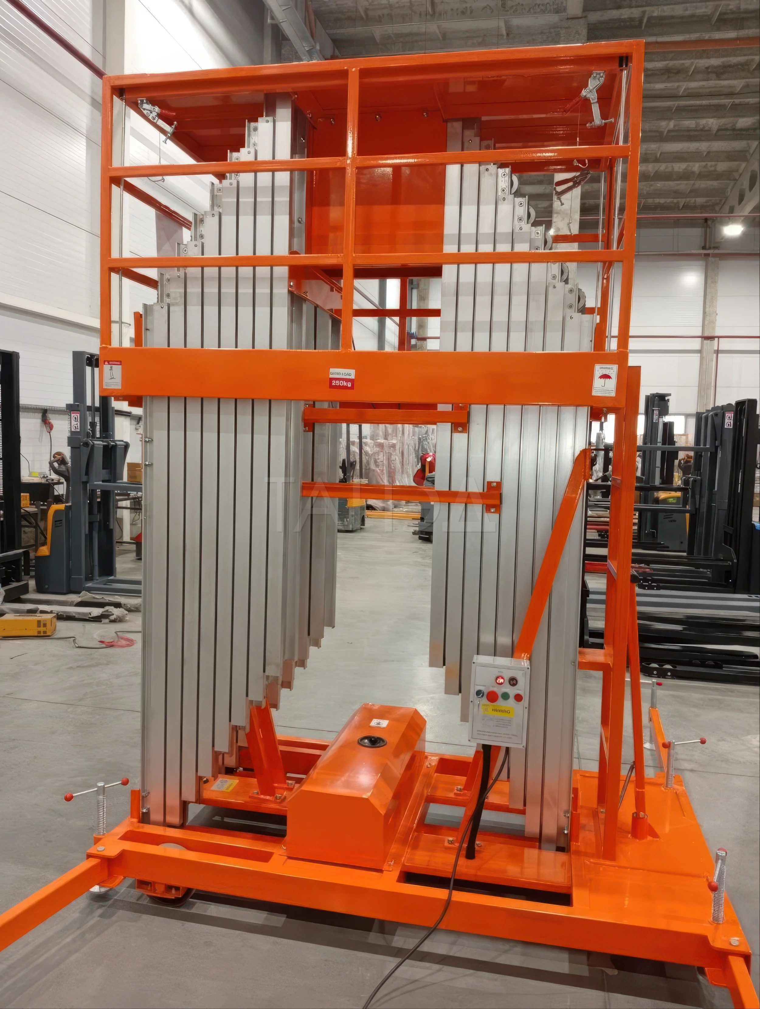 Телескопический мачтовый аккумуляторный подъемник TOR GTWY14-320 DC (G) – имеет трехмачтовую конструкцию и способен поднимать грузы весом до 250 кг на высоту до 14 метров.