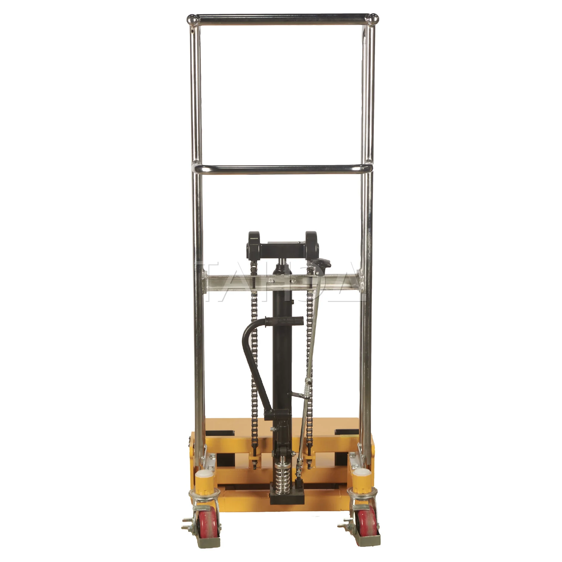 Гидравлический штабелёр TOR PJ с грузоподъёмностью 400 кг и высотой подъёма до 1,3 м. Конструкция из стальных труб обеспечивает лёгкость и мобильность. Подходит для перемещения лёгких грузов в торговых точках, мастерских и офисных складах.