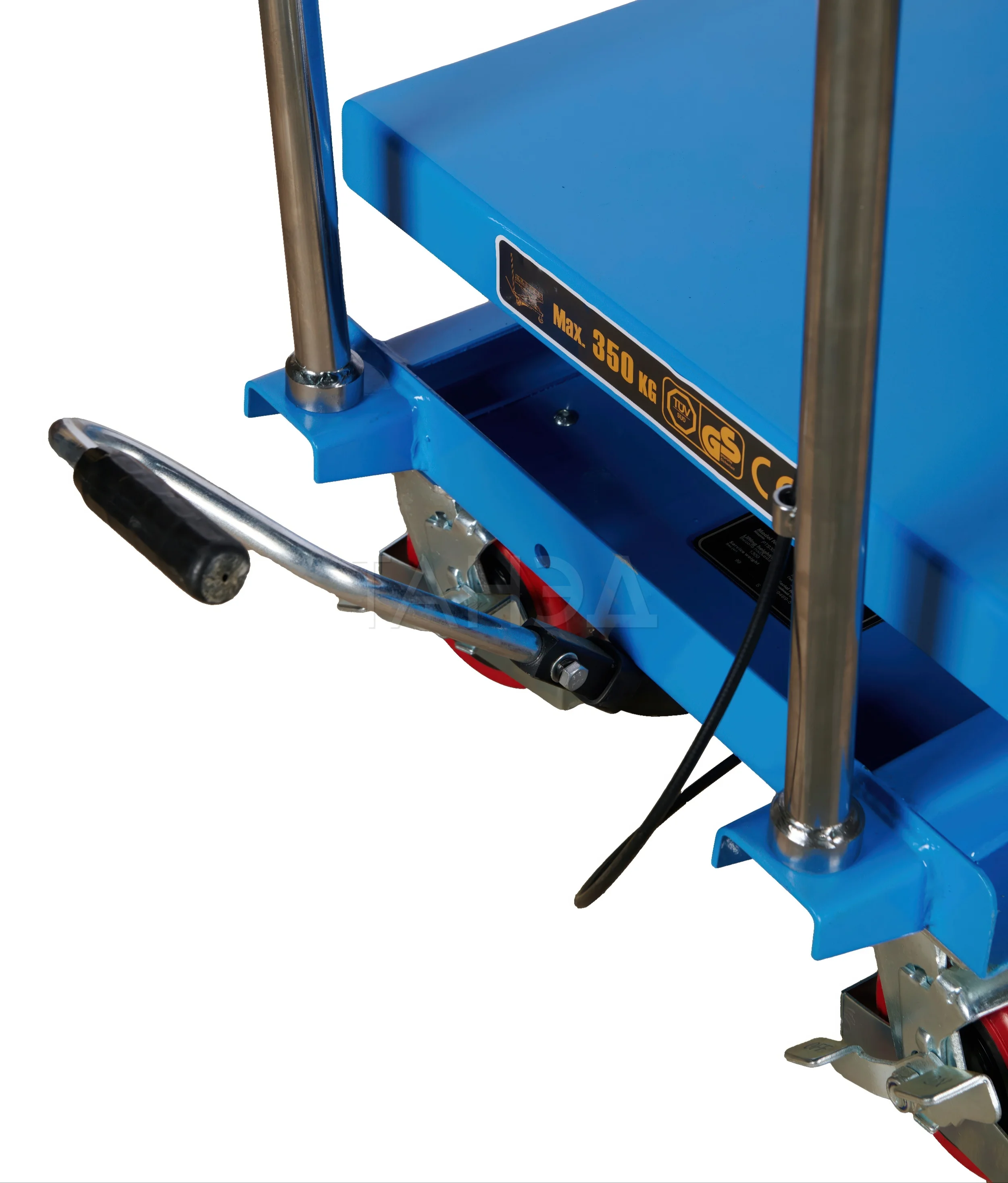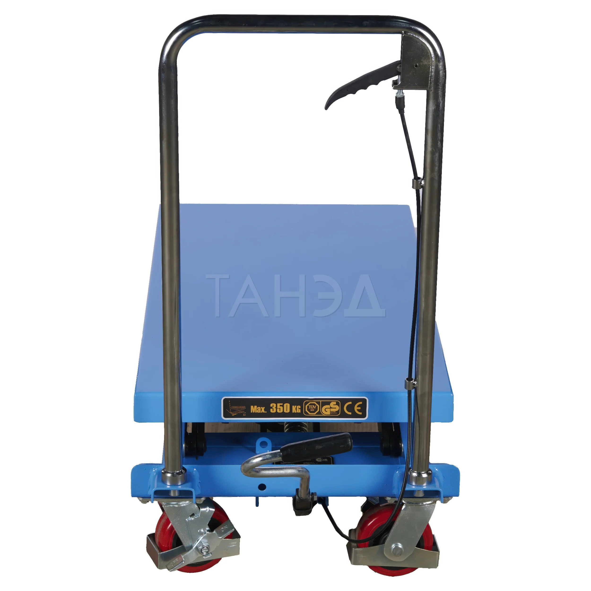 Гидравлический передвижной подъемный стол TOR PTS350A (S) способен поднимать грузы весом до 350 кг на высоту в диапазоне от 360 мм до 1300 мм. Габариты платформы 905х500 мм.