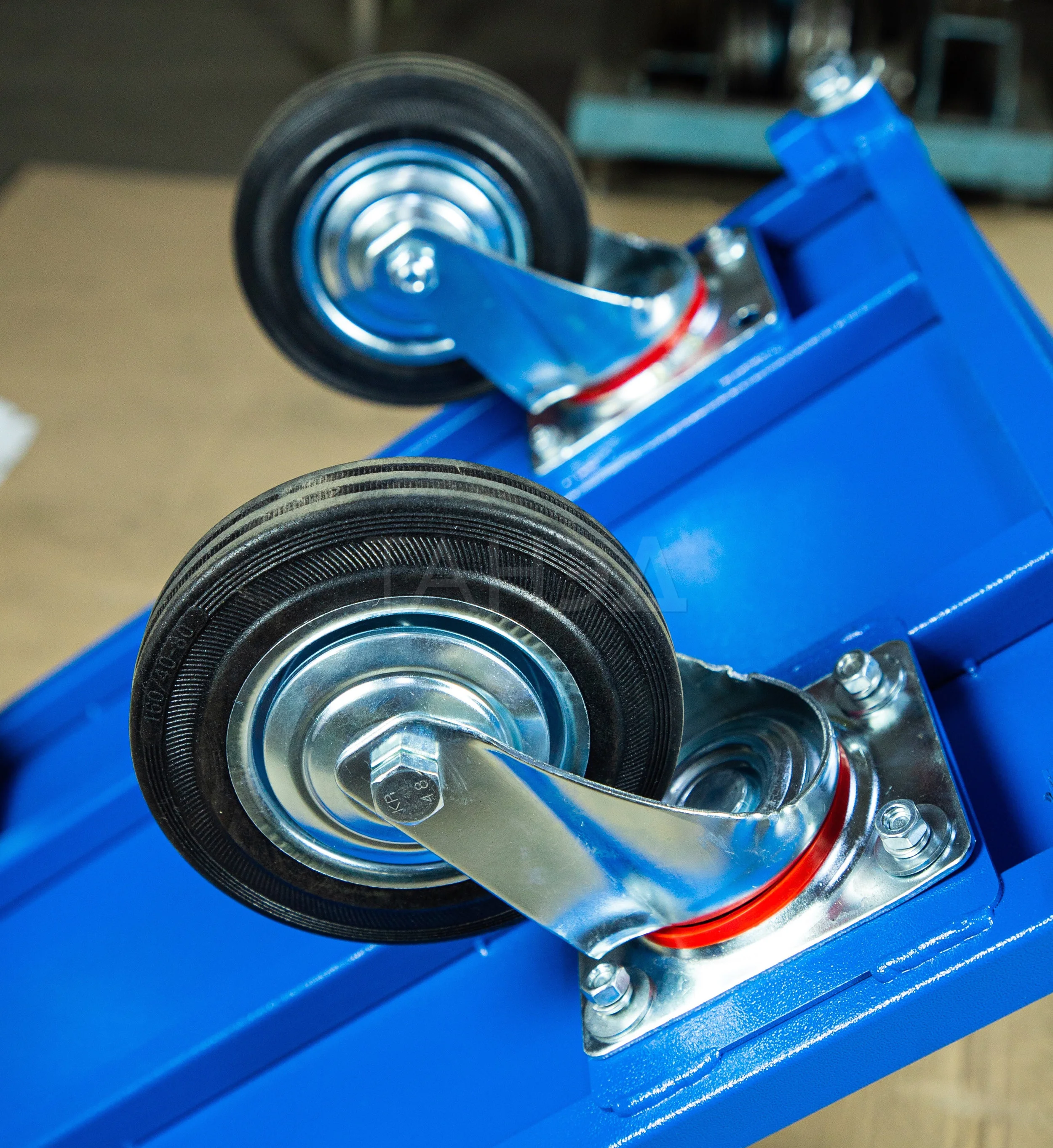 - Колесная база. Тележки в стандартном исполнении четырехколесные, удлиненные – шестиколесные, что позволяет распределить нагрузку и обеспечивает максимальную устойчивость. Диаметр колес зависит от модели оборудования и составляет от 125 до 200 мм. Изготовлены колеса из прочной резины, которая не повреждает напольное покрытие, амортизирует на неровностях, обеспечивая плавный ход.