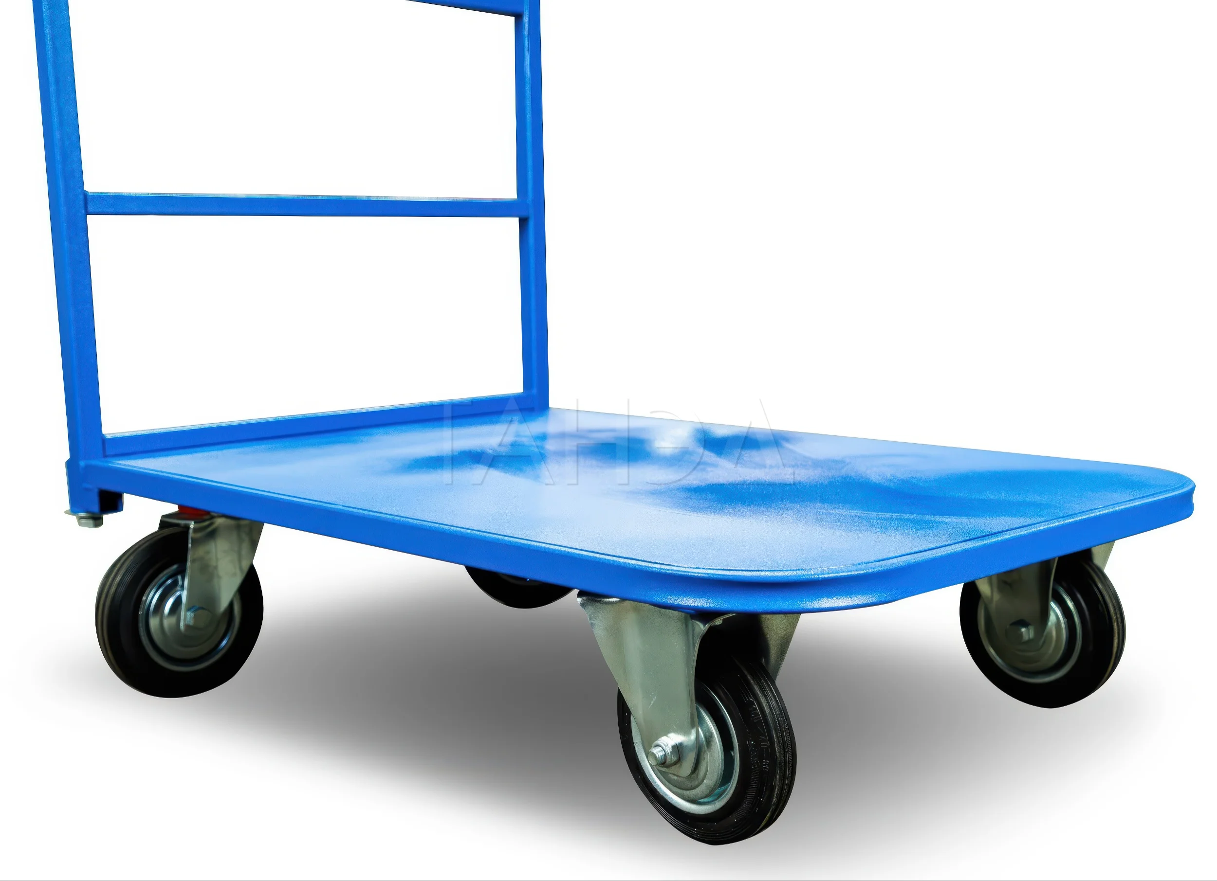 Каркас платформенных тележек TOR серии ТП изготавливается из стального профиля с толщиной стенки 1-1,2 мм. Это обеспечивает необходимую жесткость конструкции. Для повышения прочности сварные швы выполняют усиленными. Порошковое окрашивание создает на стальных элементах надежное защитно-декоративное антикоррозионное покрытие, устойчивое к механическим повреждениям, истиранию, воздействию агрессивных сред. Эргономичная форма рукояток делает управление тележкой более удобным.