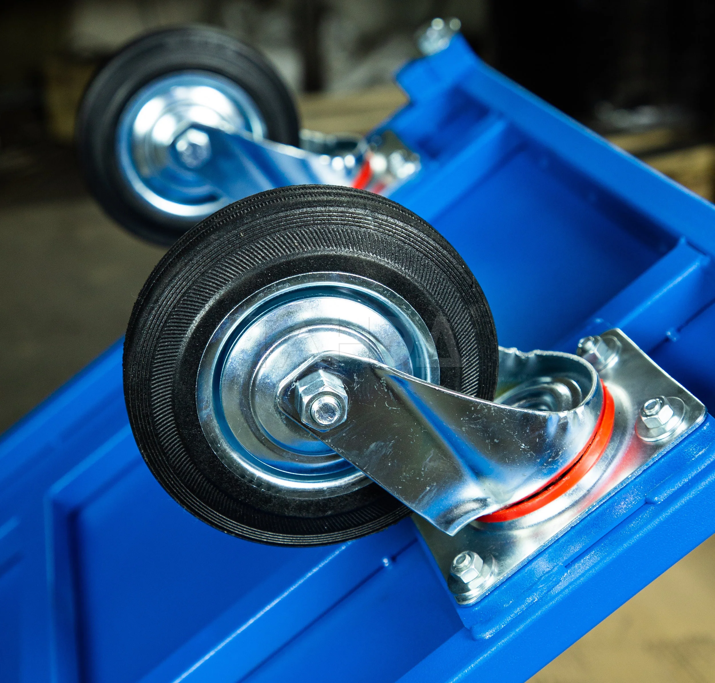 - Колесная база. Тележки в стандартном исполнении четырехколесные, удлиненные – шестиколесные, что позволяет распределить нагрузку и обеспечивает максимальную устойчивость. Диаметр колес зависит от модели оборудования и составляет от 125 до 200 мм. Изготовлены колеса из прочной резины, которая не повреждает напольное покрытие, амортизирует на неровностях, обеспечивая плавный ход.