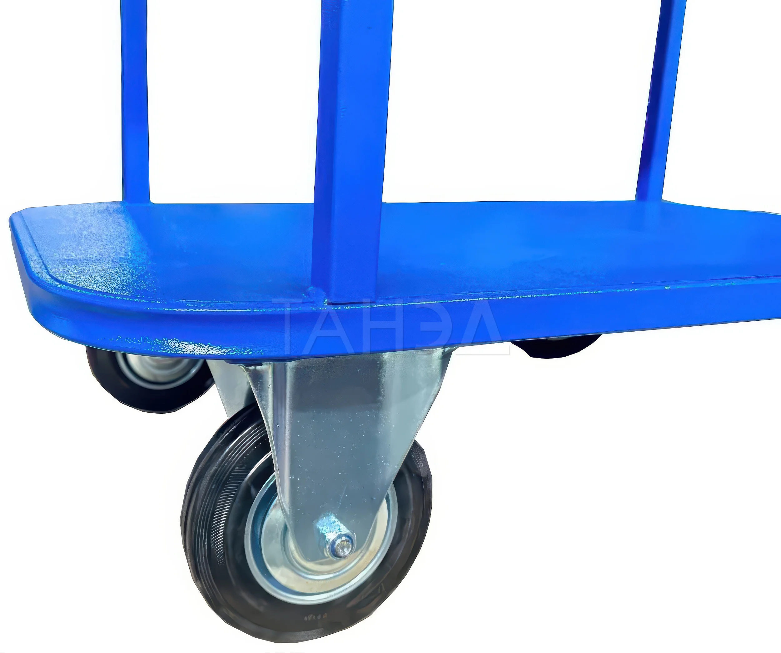 Каркас платформенных тележек TOR серии ТП изготавливается из стального профиля с толщиной стенки 1-1,2 мм. Это обеспечивает необходимую жесткость конструкции. Для повышения прочности сварные швы выполняют усиленными. Порошковое окрашивание создает на стальных элементах надежное защитно-декоративное антикоррозионное покрытие, устойчивое к механическим повреждениям, истиранию, воздействию агрессивных сред. Эргономичная форма рукояток делает управление тележкой более удобным.