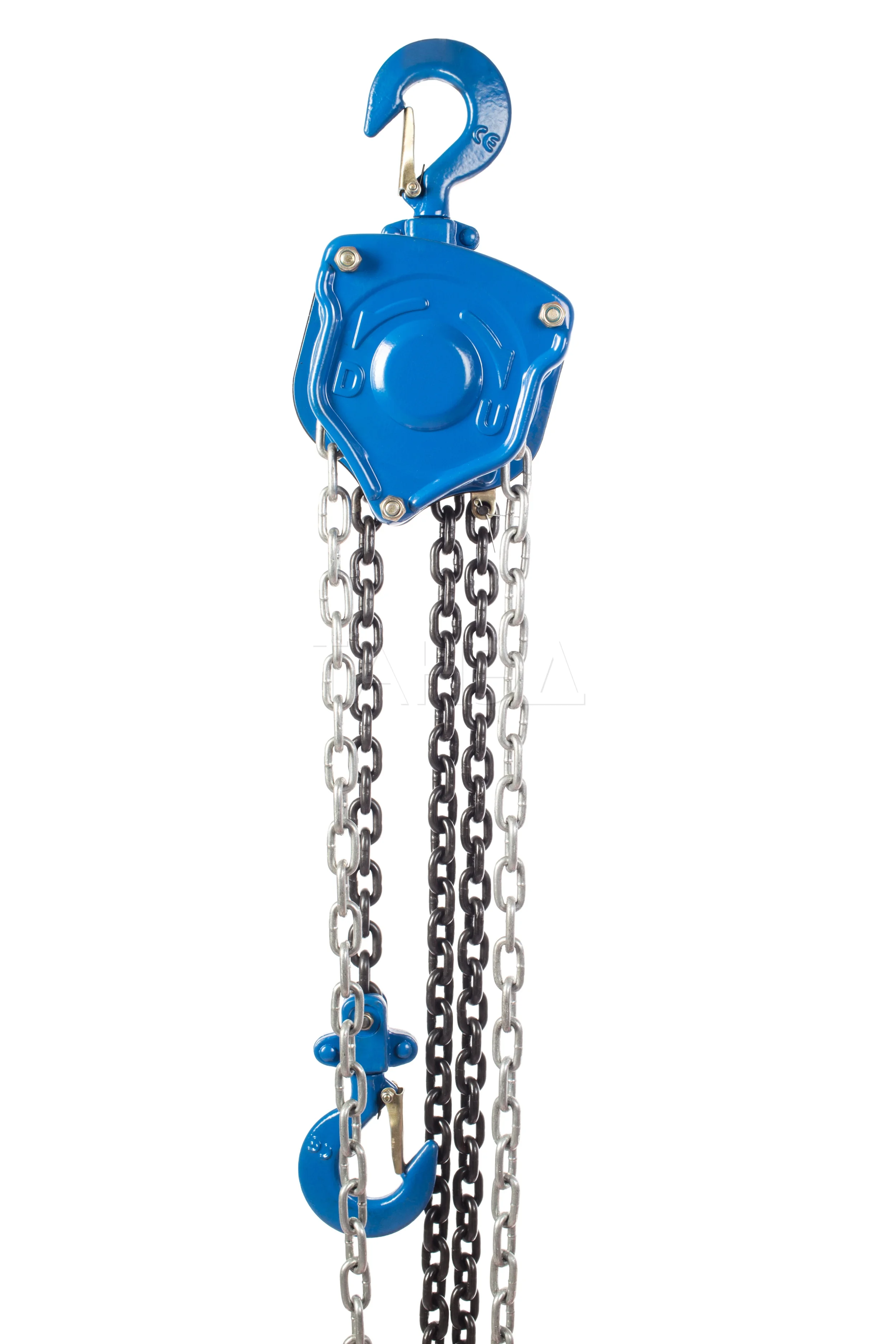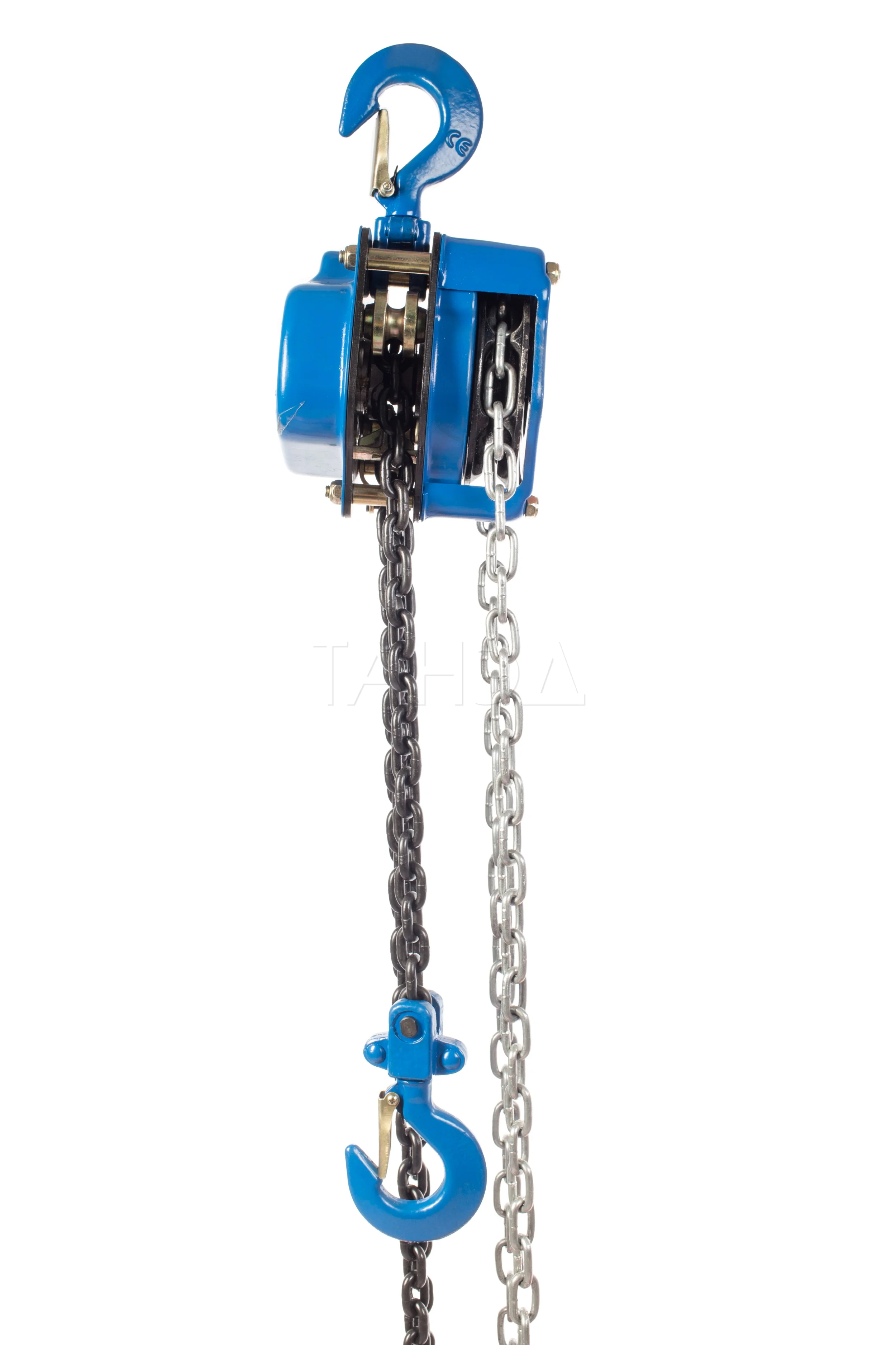 Прочная стальная конструкция корпуса защищает внутренние механизмы от механических повреждений. Грузовая цепь имеет калиброванный шаг и проходит термообработку, что повышает ее износостойкость и срок службы.