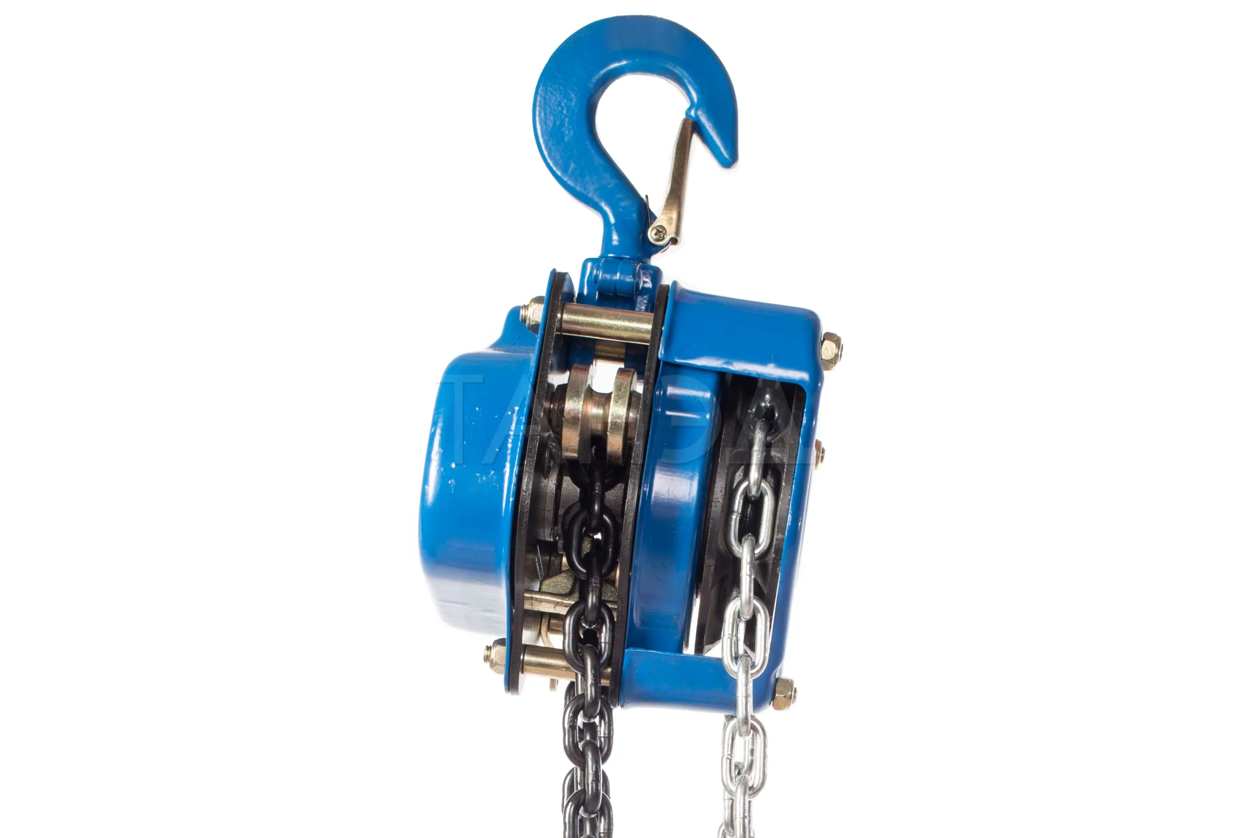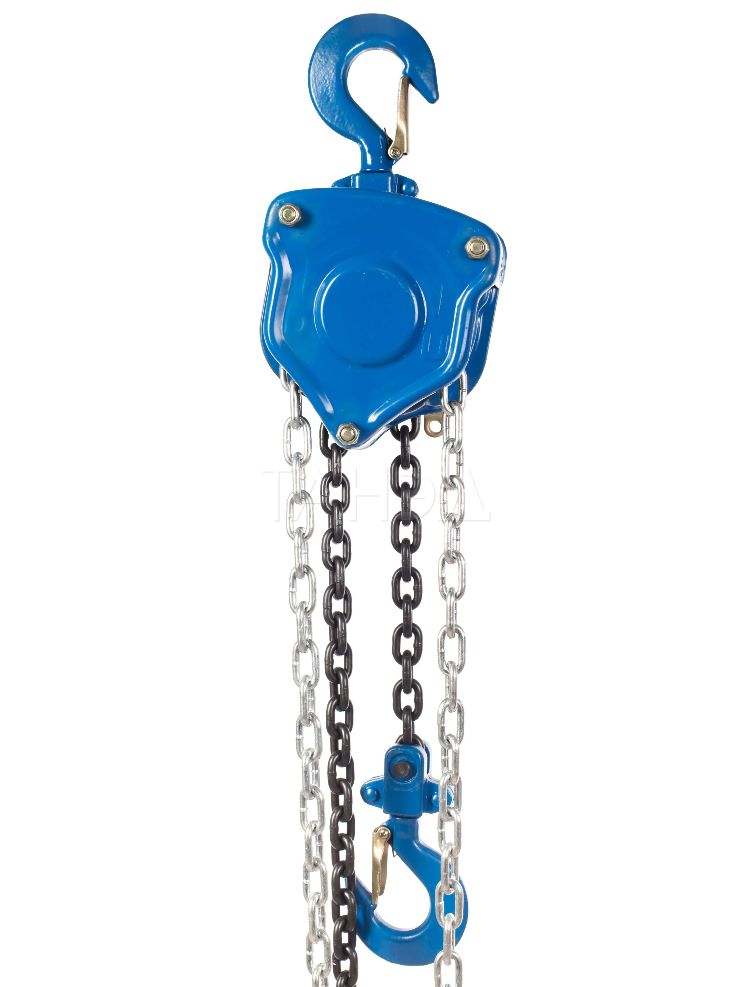 Прочная стальная конструкция корпуса защищает внутренние механизмы от механических повреждений. Грузовая цепь имеет калиброванный шаг и проходит термообработку, что повышает ее износостойкость и срок службы.