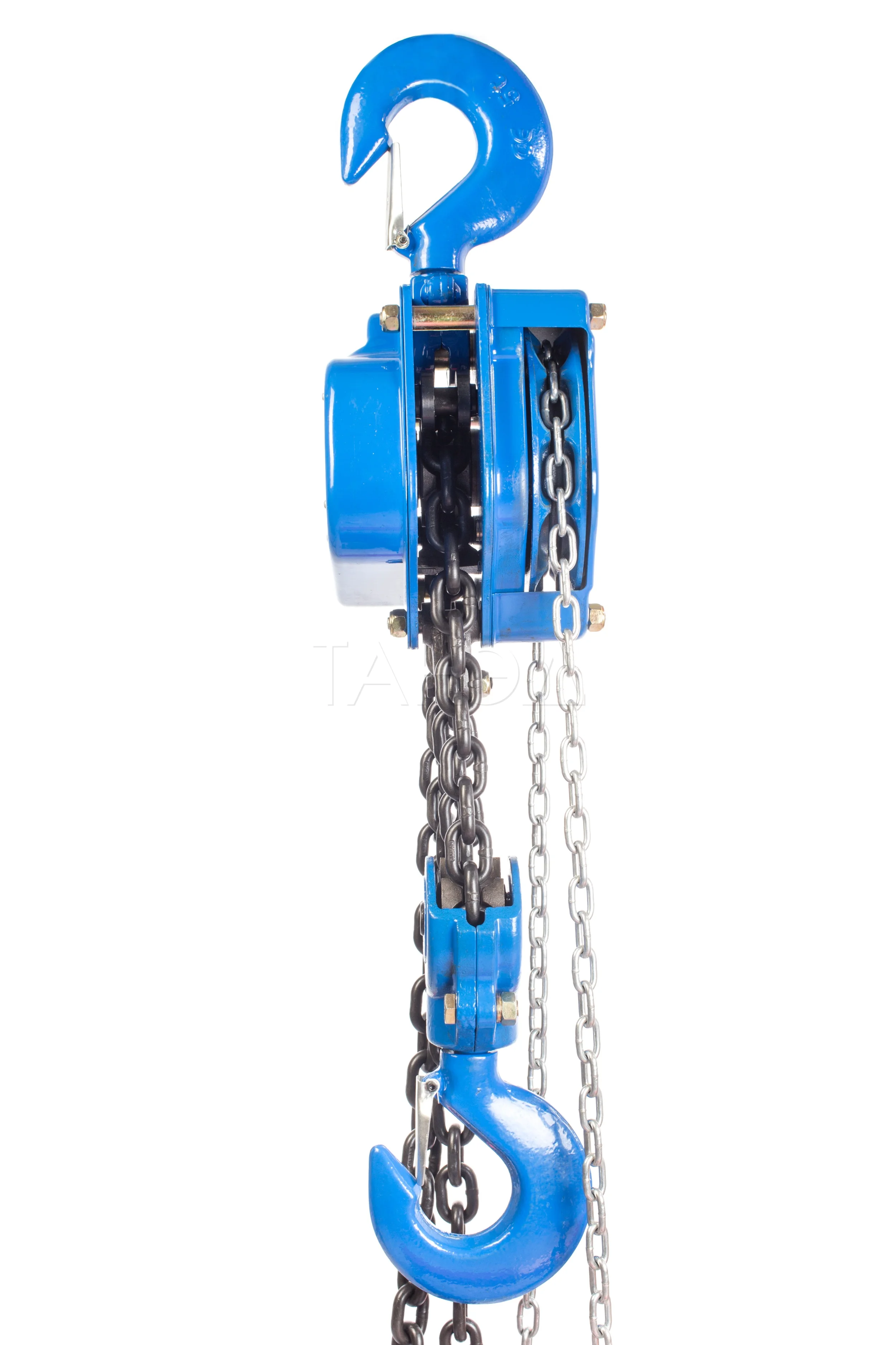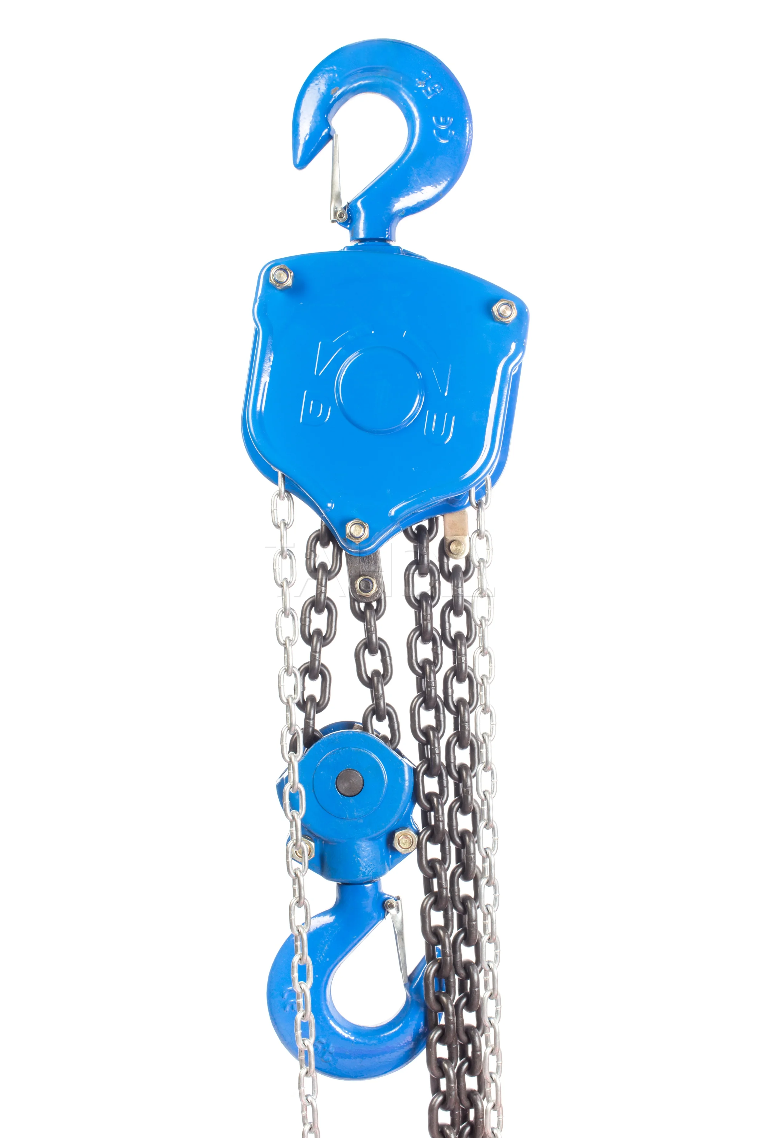 Прочная стальная конструкция корпуса защищает внутренние механизмы от механических повреждений. Грузовая цепь имеет калиброванный шаг и проходит термообработку, что повышает ее износостойкость и срок службы.
