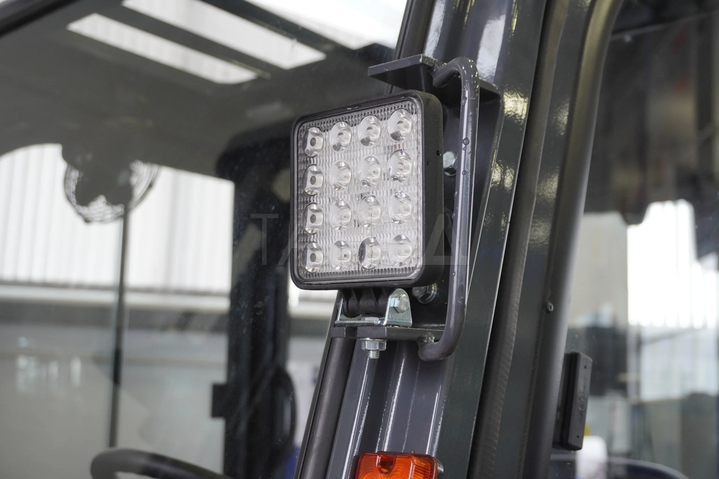 - кабина с прочной решетчатой крышей (для защиты от падающих предметов), компактной мачтой, которая обеспечивает широкий обзор;