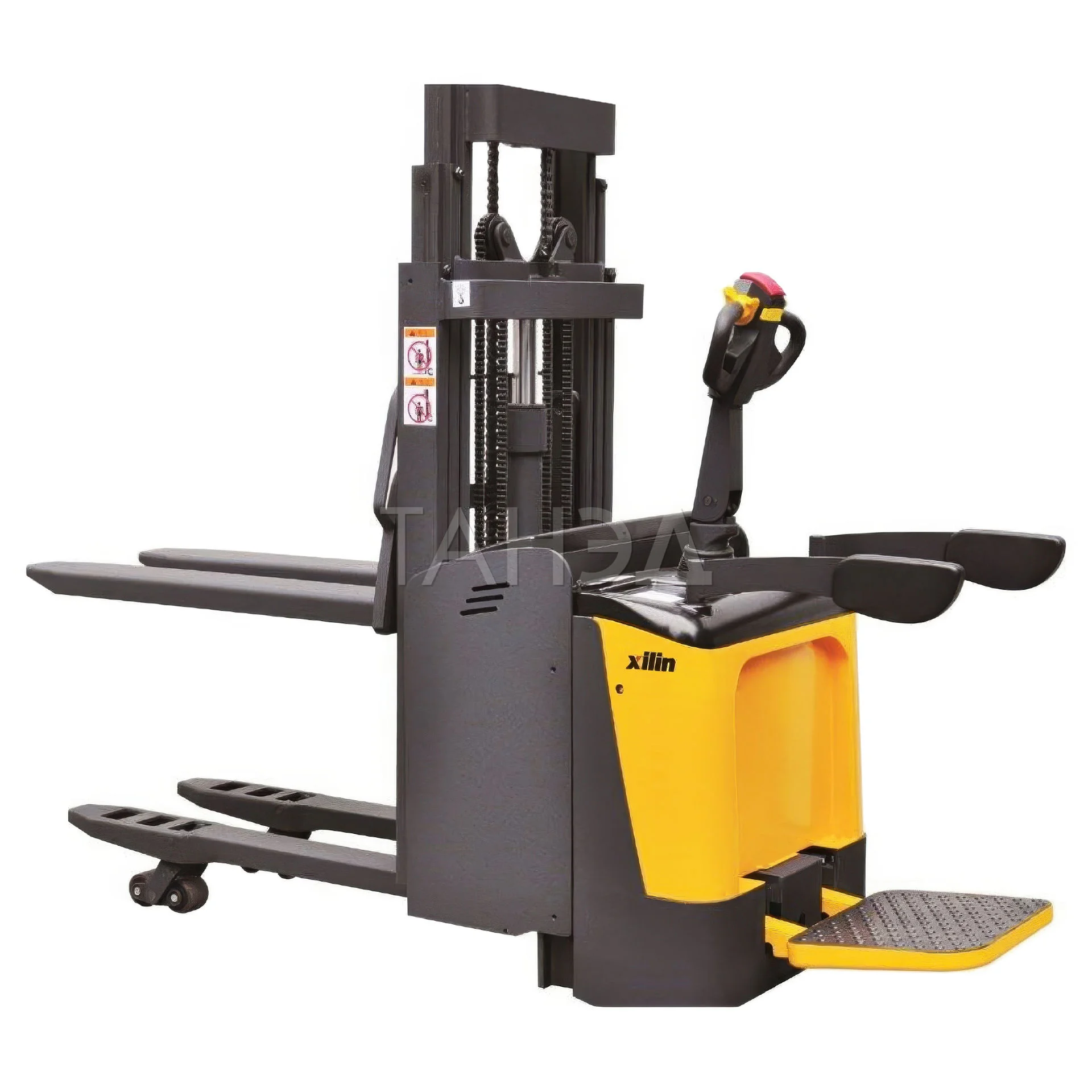 Грузоподъемность двухуровневой электрической самоходной тележки XILIN CBD20SR составляет 2000 кг. Модель с платформой для оператора и вилами увеличенной длины – 1600 мм.