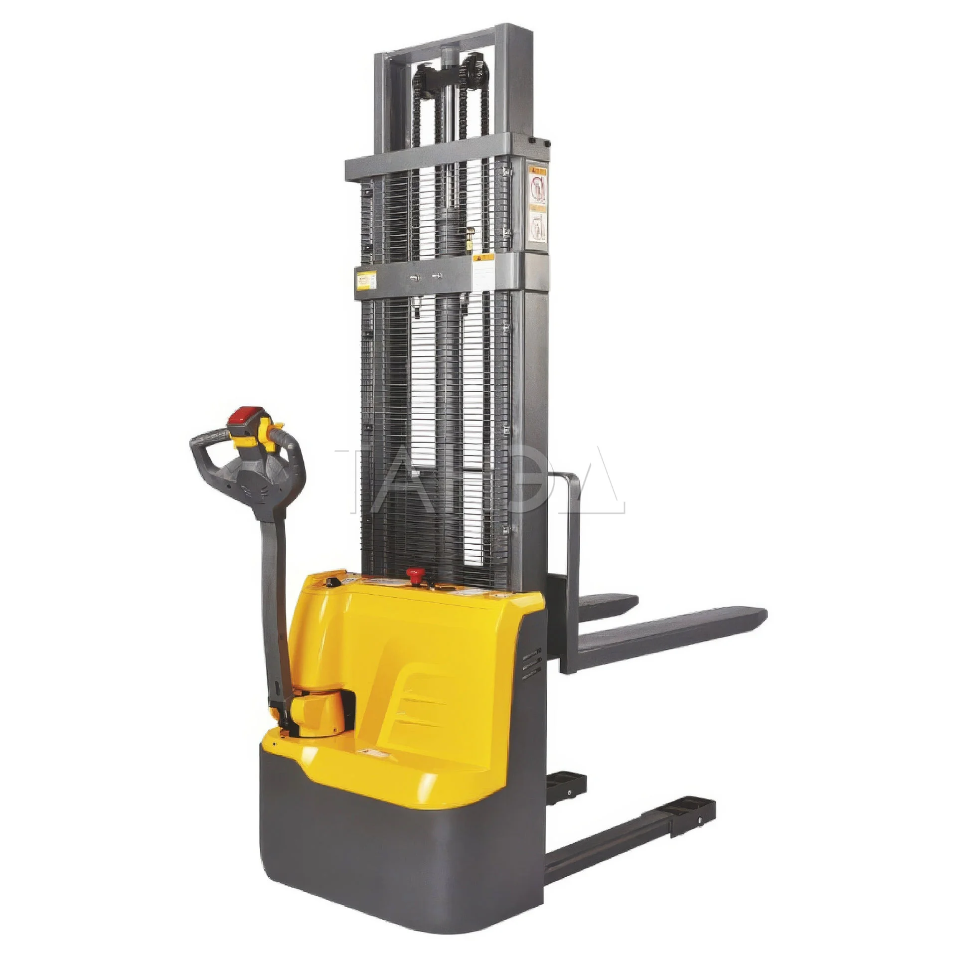 Конструкция штабелёров включает усиленную стальную раму, одно-, двух- или трёхсекционную мачту и герметичные подшипники, рассчитанные на длительную эксплуатацию в режиме полной смены. Привод — электрический, мощность — от 0,8 до 1,5 кВт, напряжение питания — 24 В. Аккумуляторы доступны в двух исполнениях: свинцово-кислотные (WET) и литий-ионные (Li-ion). Версии с Li-ion аккумуляторами можно подзаряжать в короткие перерывы — это позволяет использовать технику без остановок на полную зарядку и сокращает простои на 30–40%. Скорость подъёма вил — до 120 мм/с (с грузом), опускания — до 160 мм/с, что обеспечивает высокую производительность при штабелировании.