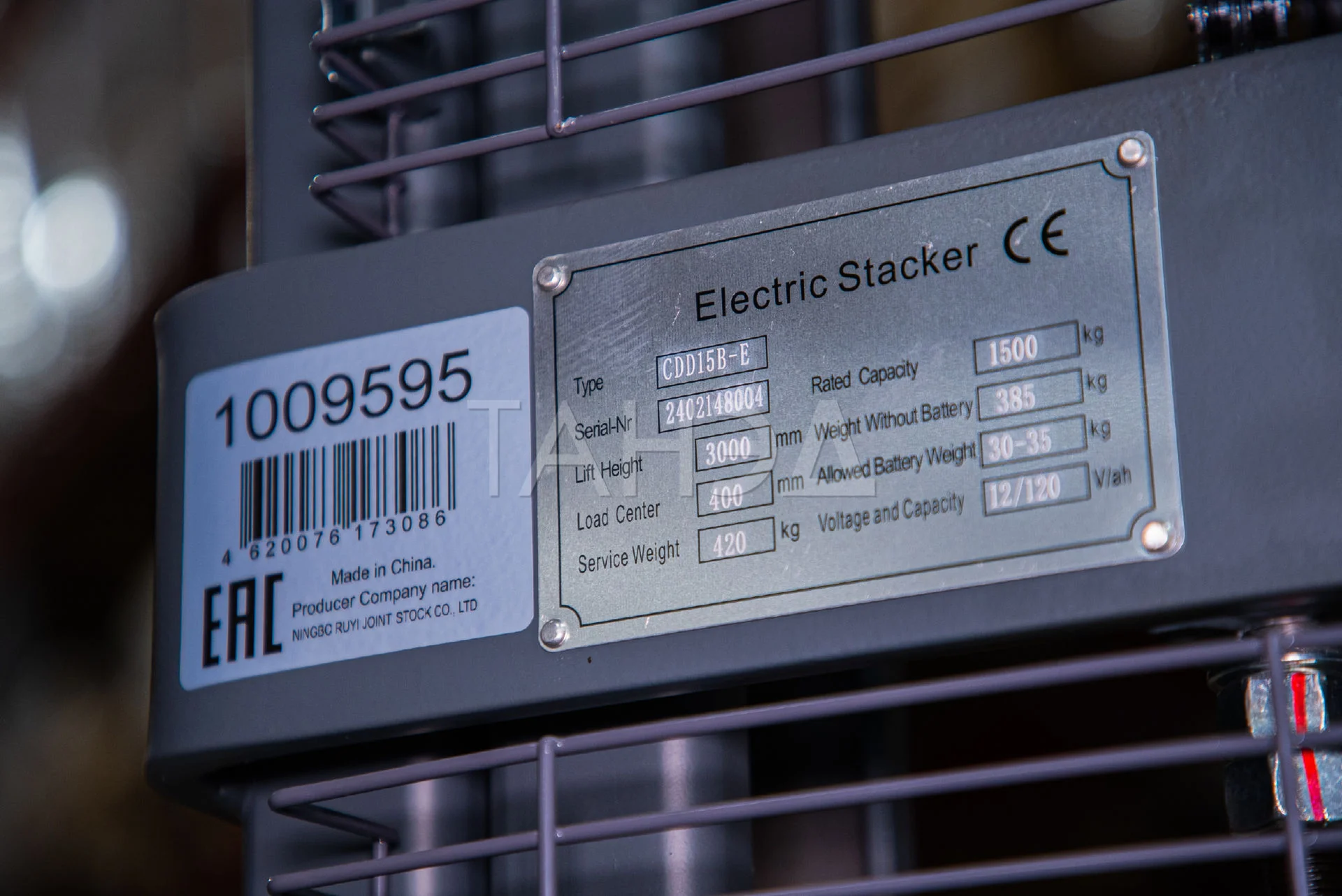 Гидравлический штабелёр XILIN CDD15B-E с электроподъёмом. Грузоподъёмность 1500 кг, высота подъёма до 3500 мм. Раздвижные вилы для универсального захвата паллет всех распространенных стандартов.