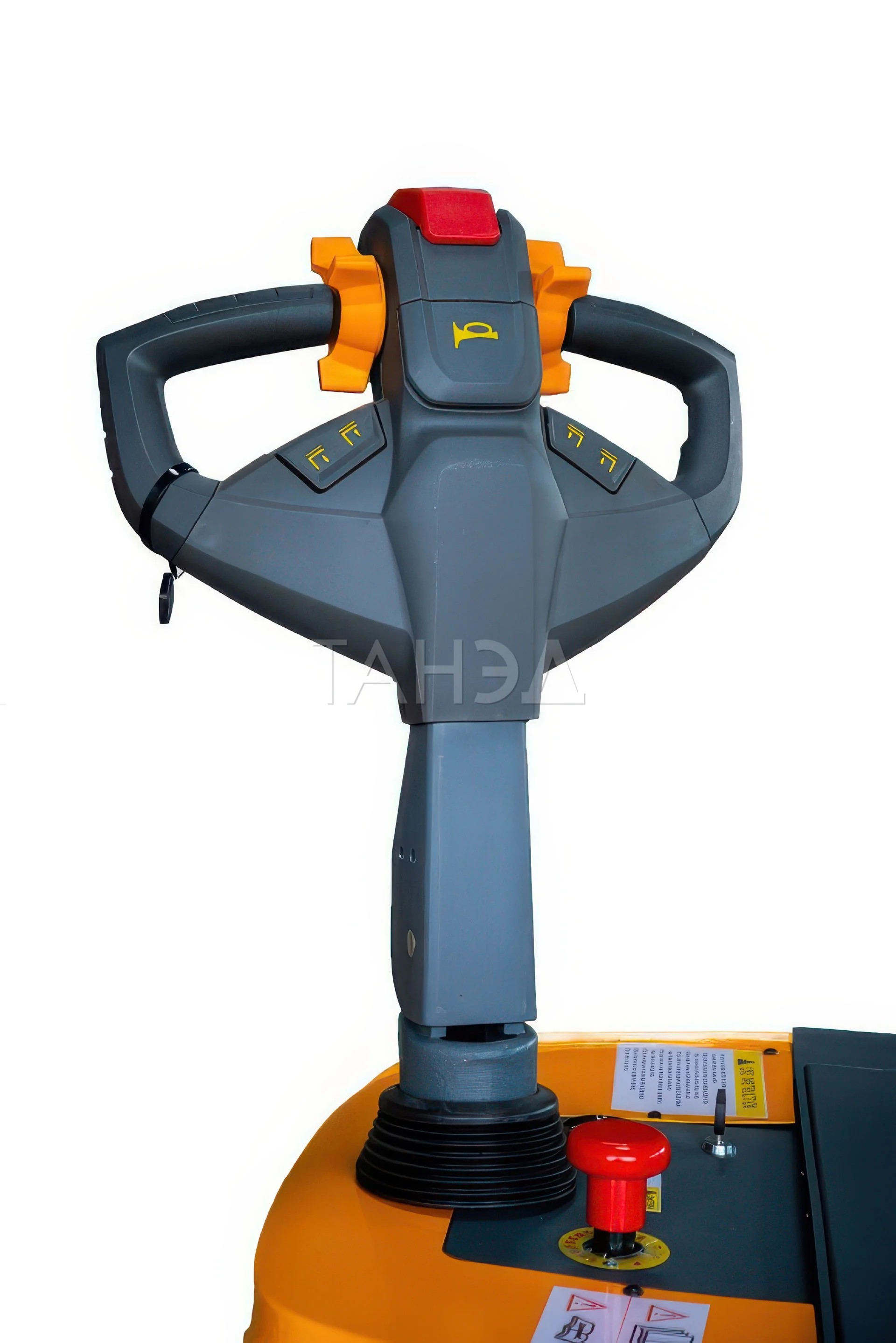 Удобная эргономичная рукоятка управления оснащена многофункциональными переключателями, дисплеем диагностики и дублирующей клавишей аварийного останова. Есть режим «черепаший ход» для особо точного маневрирования перед стеллажом. Система электронного торможения и контроля устойчивости повышает безопасность при работе на неровных полах.