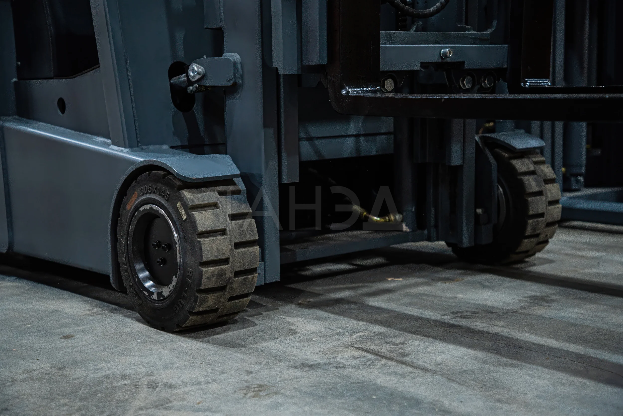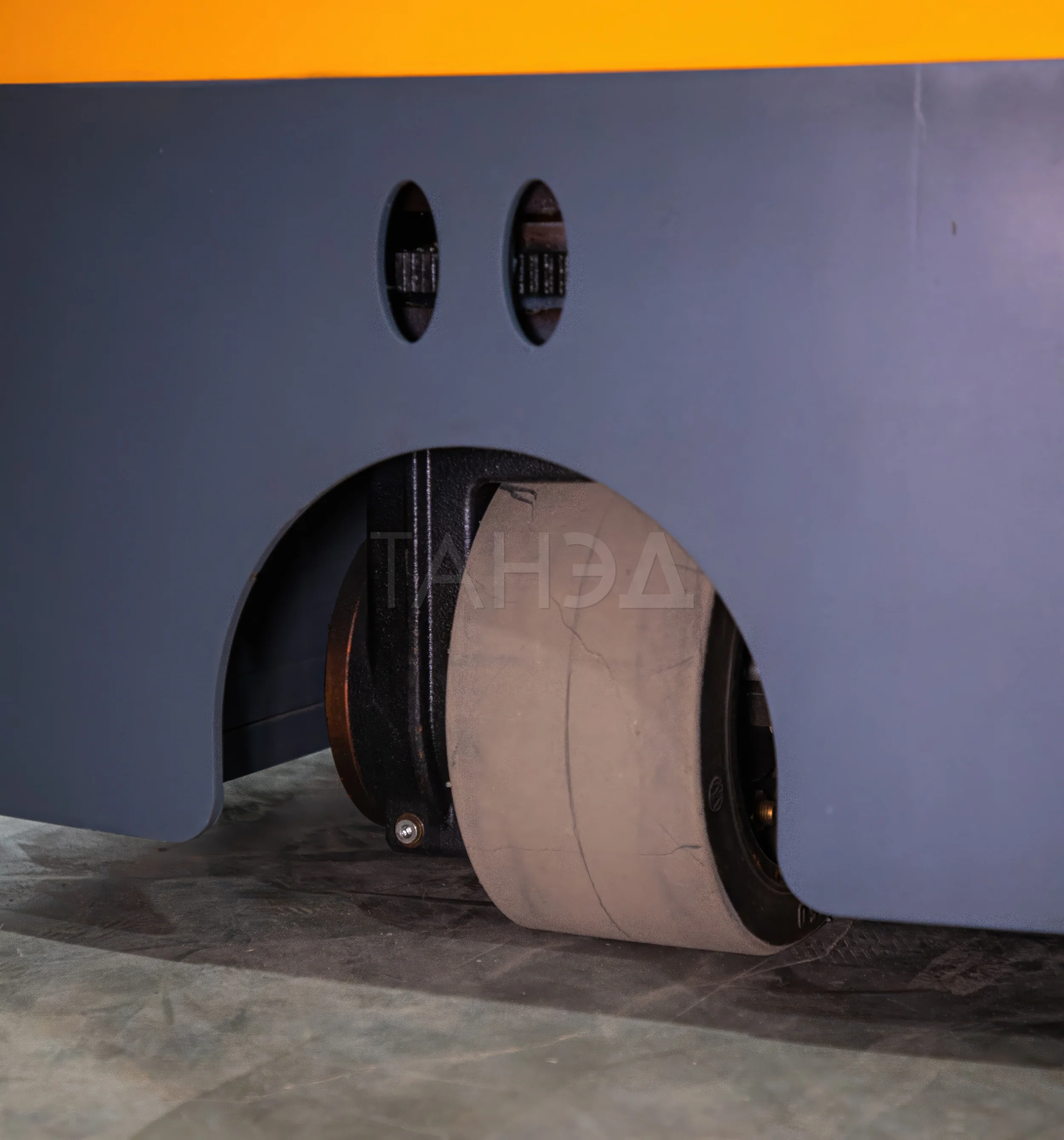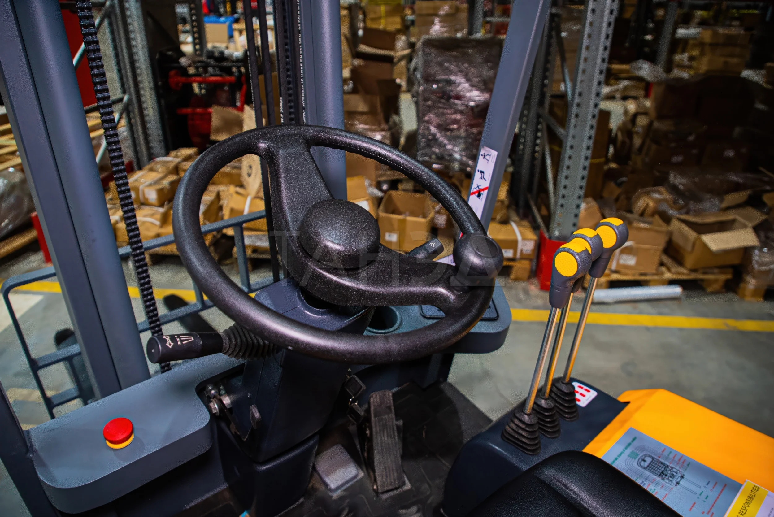 За счет трехопорной конструкции у погрузчиков данного типа малый радиус поворота. Это делает технику высокоманевренной, упрощает работу в условиях ограниченного пространства, в узких проходах между стеллажами.